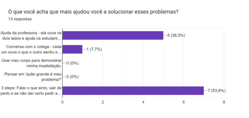 Teachers often have a wide range of strategies to help students with conflicts. Each age group and every class has its own peculiarities and most of the times teachers will sort through these strategies by trial and error. Nevertheless, second grade students are in this phase where they are still developing their maturity but we also want them to feel empowered to reflect upon their choices and be part of these conflict resolutions. This study aimed on presenting a few strategies to students and measure how much they incorporated them into their routines and thus, helping teachers with more information on efficient strategies.