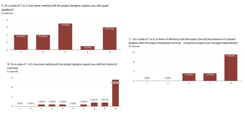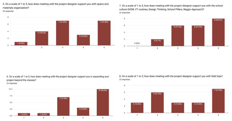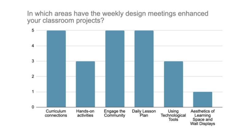 In conclusion, the weekly design meetings with project designers have proven to be a resounding success in supporting homeroom educators in planning their projects. The collaborative dynamic established with project designers as co-thinkers has generated a positive and enriching experience for educators. The feedback indicates a high level of satisfaction, showcasing that this partnership not only streamlines project planning but also fosters a sense of shared creativity and innovation. The educators' contentment with having a project designer as a co-thinker underscores the effectiveness of this collaborative model in elevating the planning process and, ultimately, enhancing the overall quality of education delivery. Nonetheless, it is acknowledged that certain aspects, such as support with field trips and guest speakers, still have room for improvement, and these areas will be targeted for enhancement in future iterations of the collaborative process.