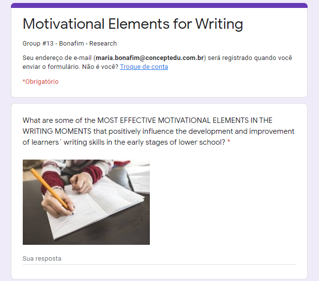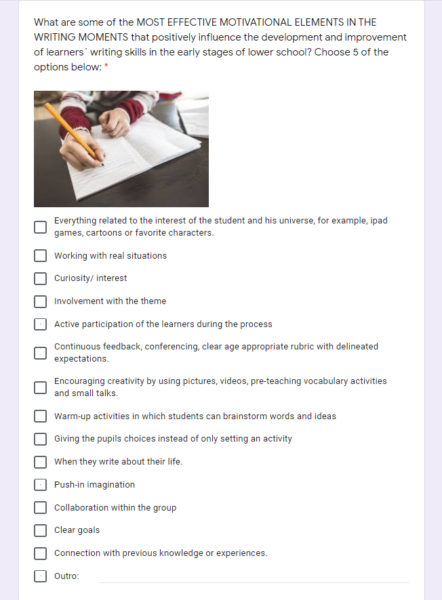 We created a Google form that was sent to educators (October 2020) in order to find out what the motivational elements that positively impact learner's writing skills were. Based on educators answers, we created a second Google form that was sent to educators (November 2020) in order to find out the most effective motivational elements that positively impact learner's writing skills.