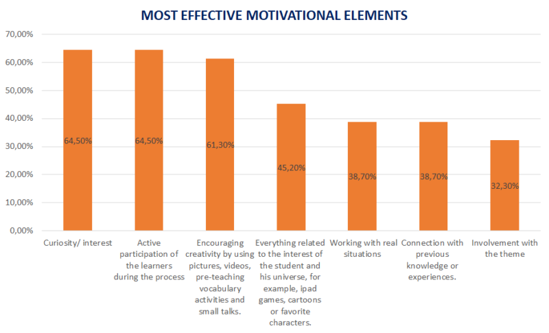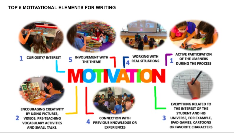 Based on the data we have collected and interpreted, some of the most effective motivational elements in the writing moments that positively influence the development and improvement of learners´ writing skills in the early stages of lower school are fostering children’s curiosity and interest, learner’s active participation during the process, and encouraging creativity by using pictures, videos, pre-teaching vocabulary activities and small talks. By interpreting the results, we understand that when the learners are the protagonists and educators provide an environment that enables a student centered learning, the chances for young children to engage and succeed are higher.