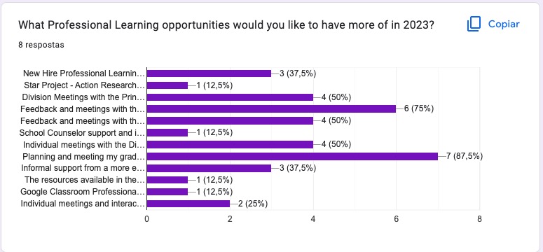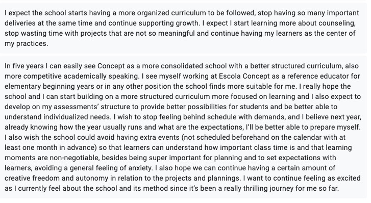 Talking about the next year, educators mentioned that they would like to continue with the grade level meetings that happen weekly, also mentioning their will to have feedback meetings with the Teaching and Learning Coach. New educators also mentioned wanting to meet the Academic Performance coach more and to meet the Division Principal individually and as a grade level.