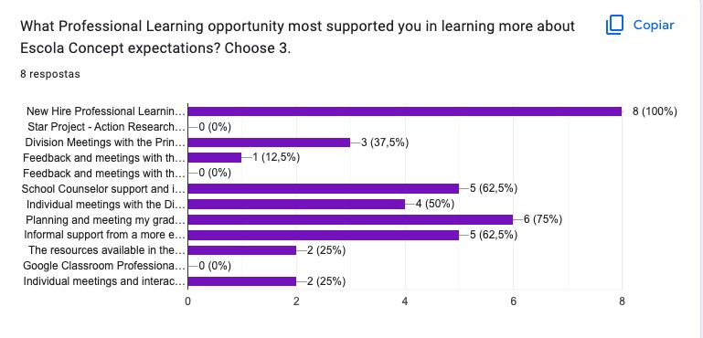 Along the year, it became relevant for me, as the division leader, to listen to my new educators' perception on the school culture itself, their understandign of expectations and the professional learning opportunities that, for them, were most impactful and effective. Therefore, with the opportunity of developing this Action Research, I became interested in measuring the perception of effectiveness of different Professional Learning Opportunities in the onboarding process of new educators during their first year at Escola Concept.