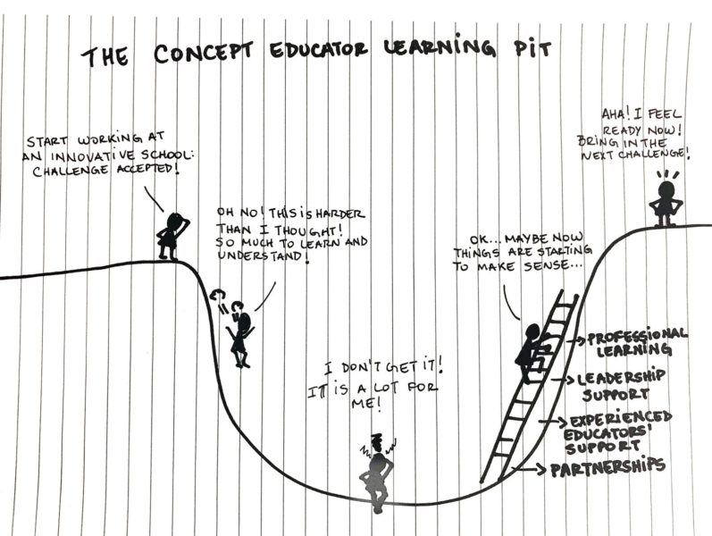 From the conversations and survey, we could notice that some points can be improved and addressed in the planning for the professional learning opportunities for next year. We understood from the data collected that we need to invest in PL moments that improve the perception and visibility of coherency, focus on learning , human-centered and celebratory mode in our school. It was important to reflect about which are the areas of focus regarding the educators' demands, allowing us a lot of food for thought regarding planning next year and the calendar of events, as well as the opportunities that will be offered. We could also understand that the acculturation in a school is a continuous process in our school and that it is not only built through professional learning, but also through the perception of many different elements that make a school. It is also important to acknowledge the process that a new educator goes through when starting to work at such an innovative and fast paced school. New educators, as lifelong learners, go through a learning pit, very similar to our young learners. At first, educators take a responsible risk to start in a very innovative school. At a second moment, they will face challenges to understand how the school works and start to face complications and contradictions trying to adjust to the new culture. With the leadership and experienced peers' support, they start to organize their ideas and understand it better. It is a lot to learn, but it starts making sense for them. Right next to it there is the part where the whole process connects and they finally start feeling more comfortable and ready to perform according to the school expectations, being now immersed in the culture. Living the process and understanding that not all of it will be comfortable is essential. Us, as leaders, are here to make those hard steps become more smooth and to make sure that educators feel supported at all times in this journey.