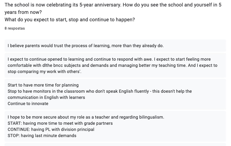 Along the school year, I collected new educator's perception in a 1:1 conversation/interview with me, their principal, along the school year, registered in my appraisal documents. During this conversations, I collected words that they would use to describe the school culture. At the end of the school year, I applied a survey with them, asking specific questions about their perception on how effective the different Professional Learning opportunities were for their development (Action Research, Division Meetings, Individual Meetings, Lesson Observation and Feedback, Feedback on Planning, among others). In the survey I also included a list of words mentioned by them along the school year to define culture, they could choose more than one.