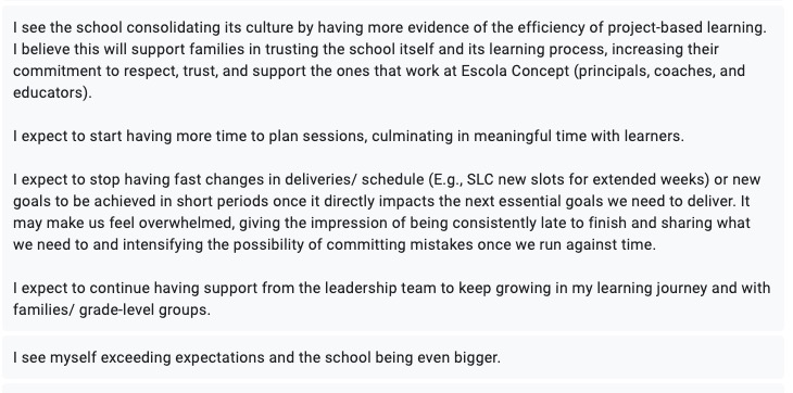 During this year of 2022, I welcomed many new talents in my team of educators and, as Escola Concept requires educational practices and deliveries that are not known in other Brazilian schools, the onboarding and aculturation process might take effort, planning and time from the leadership team.
