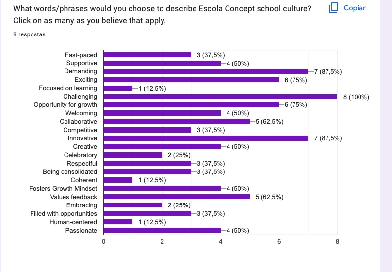 Diving deeper into the concept of "culture" has been a topic of my interest in the latest years, mainly because Escola Concept fosters the understanding of the 8 Cultural Forces, as in the book "Creating Cultures of Thinking: The 8 Forces We Must Master to Truly Transform Our Schools" by Ron Ritchhart, a senior research associate with Project Zero at the Harvard Graduate School of Education (2015, Jossey-Bass Ed.).