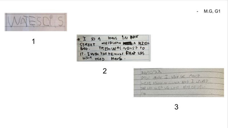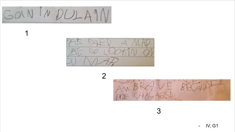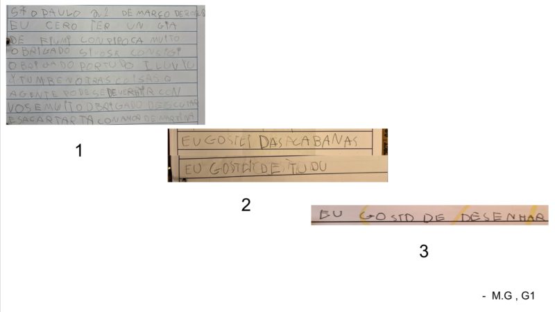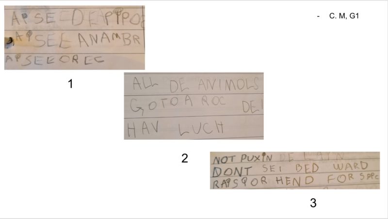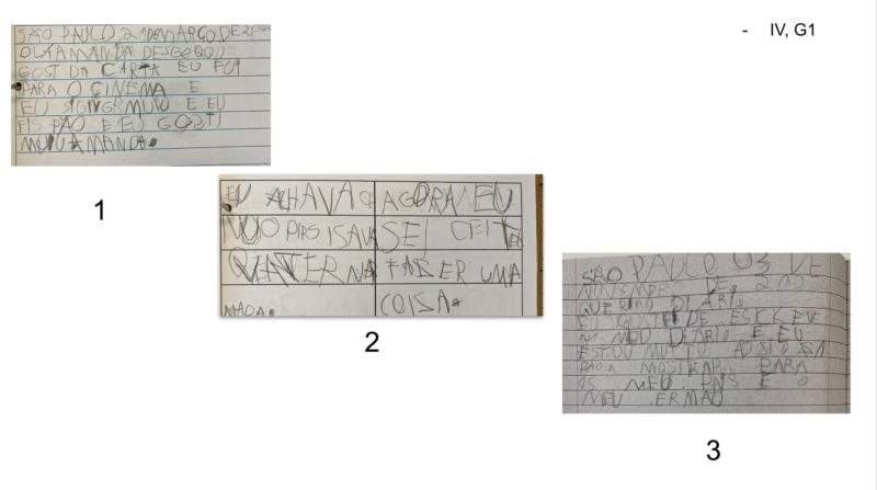We collected learners' written hypothesis in both languages (english and portuguese), from throughout the year to observe possible instances of tranferences in the literacy process. We searched for written work from the beginning, middle and end of the school year to show as evidence of tranferences during literacy acquisition process.
