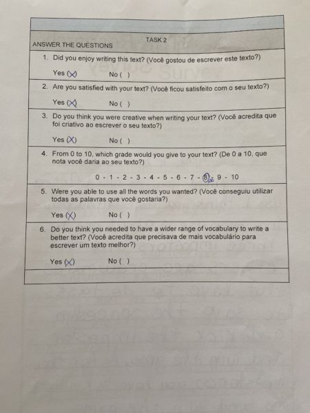 QUESTIONS 1 AND 2: Almost 90% of students enjoyed doing the task and were satisfied with their productions, which showed us that this group demonstrates confidence in writing.