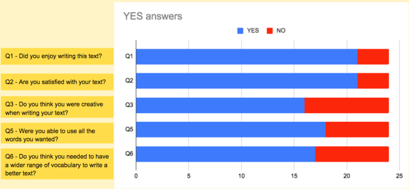 QUESTIONS 5 AND 6: Even though 70% of students said they were able to use all the words they wanted, the majority thinks that they still need a wider range of vocabulary to write even better.