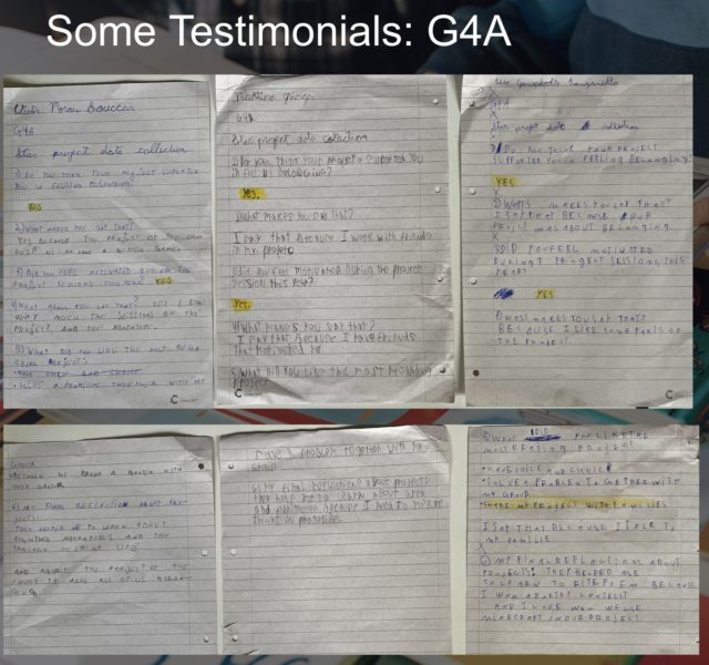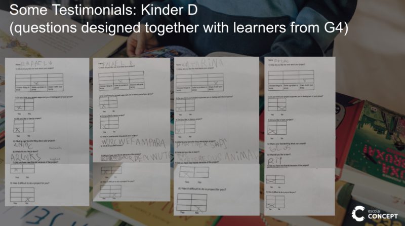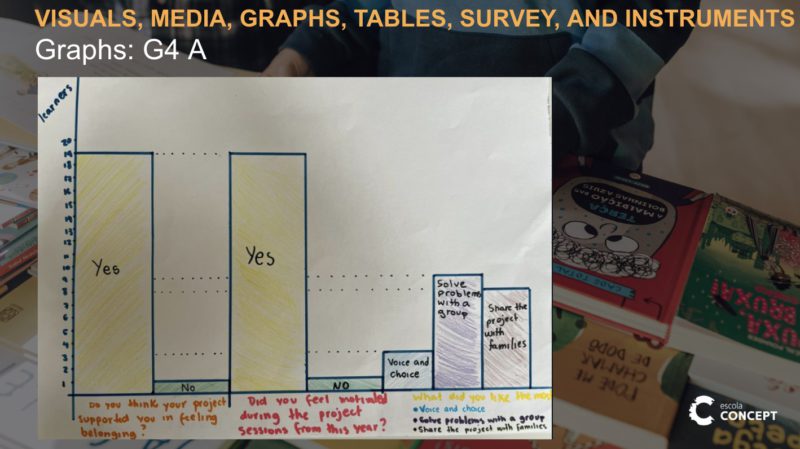 The testimonials presented, which also resulted in a graph, were carefully thought out and answered by Grade 4A and Kinder D. Learners had to evaluate their own experiences of working with projects and their benefits on their learning process, also considering their social-emotional as well.