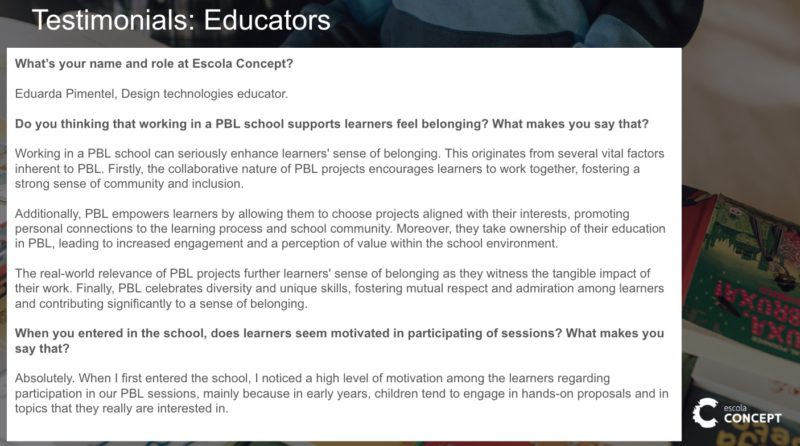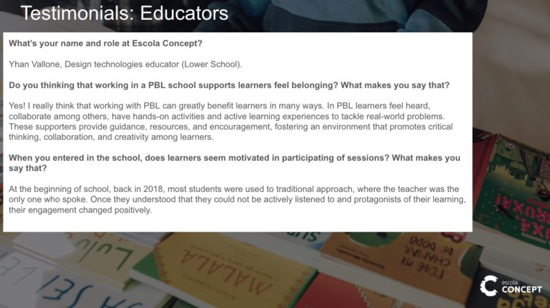 Belonging is a fundamental human need. Therefore, learners' sense of belonging seems connected to a strong influence on well-being, motivation, and supporting academic achievements. What was observed by the researchers, Yumi and Larissa, was that when learners had voice and choice, they seemed to be happier and engaged in the project flow. According to the previous reflections, working on projects may benefit learners as they seek a world problem solution connected to their interests and daily lives, think interdependently, take responsible risks, and remain open to continuous learning. It makes learning visible and reliable to them.