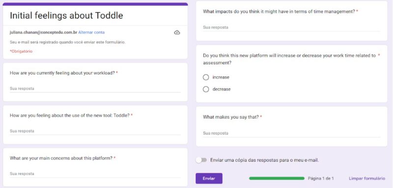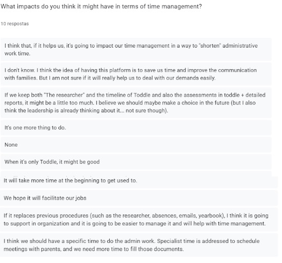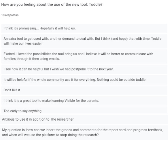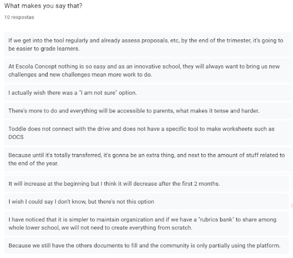 Our plan is to stick with that topic for the next year because we were unable to complete our second research, just so we can hear what educators have to say about the platform's implementation and formative assessment. Educators observations are relevant data for the school's leadership in order to have this transition smoother and effective for all stakeholders envolved.