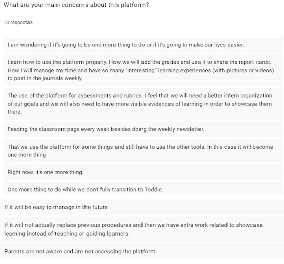 They mention several concerns in starting using this tool: the initial increase of workload in the end of the year with events happening at the same time, parents not accessing Toddle, having to learn how to use a new tool and dealing with its bugs and adaptations.