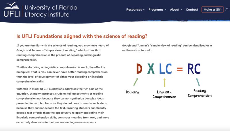 (...) UFLI Foundations addresses the “D” (decoding) part of the equation. In many instances, students fail assessments of reading comprehension not because they cannot synthesize complex ideas presented in text, but because they do not have access to such ideas because they cannot decode the text. Ensuring students can fluently decode text affords them the opportunity to apply and refine their linguistic comprehension skills, construct meaning from text, and more accurately demonstrate their understanding on assessments.